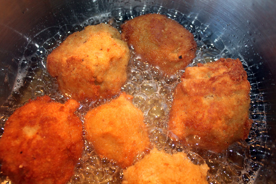 Die panierten Kartoffeln in heißem Öl von allen Seiten goldbraun frittieren.