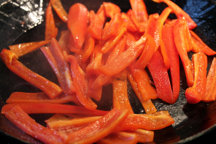 Die Paprikastreifen mit etwas Öl in einer Pfanne bissfest dünsten und mit Salz und Pfeffer würzen.