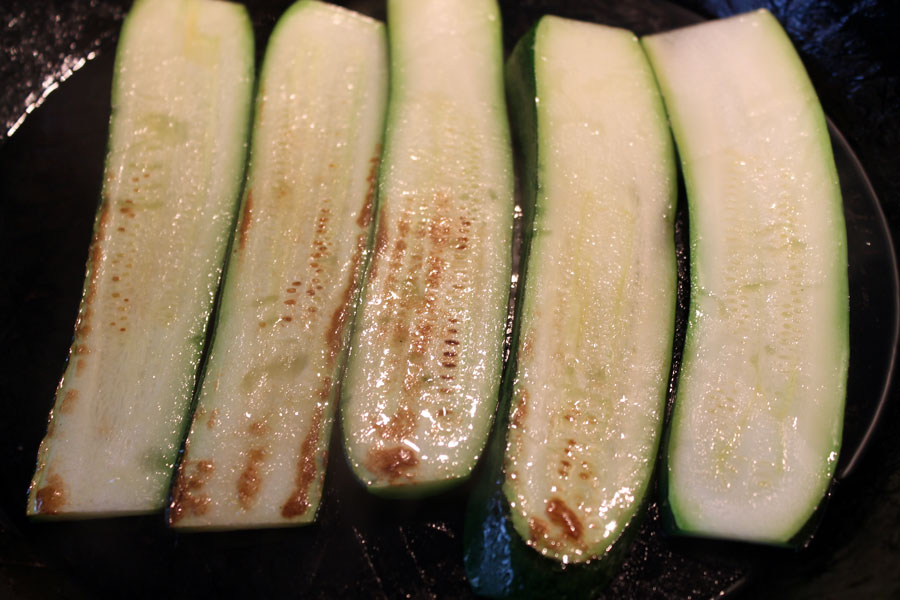 In einer zweiten Pfanne die Zucchinischeiben ebenfalls mit etwas Öl von beiden Seiten braten und leicht salzen.