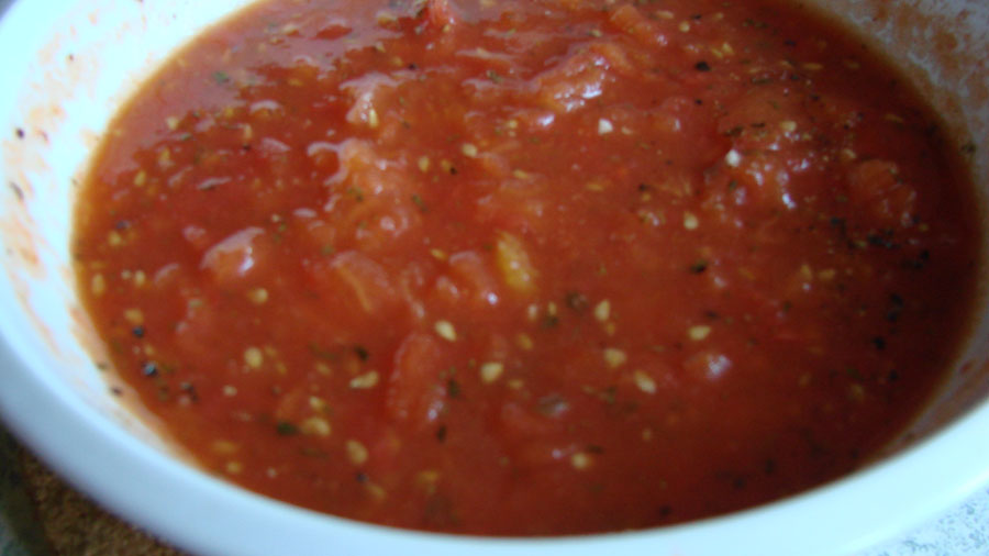 Die Tomaten mit dem Sud auf Spaghetti oder anderer Pasta anrichten, mit Pfeffer würzen und mit frisch geraspelten Parmesan bestreuen.