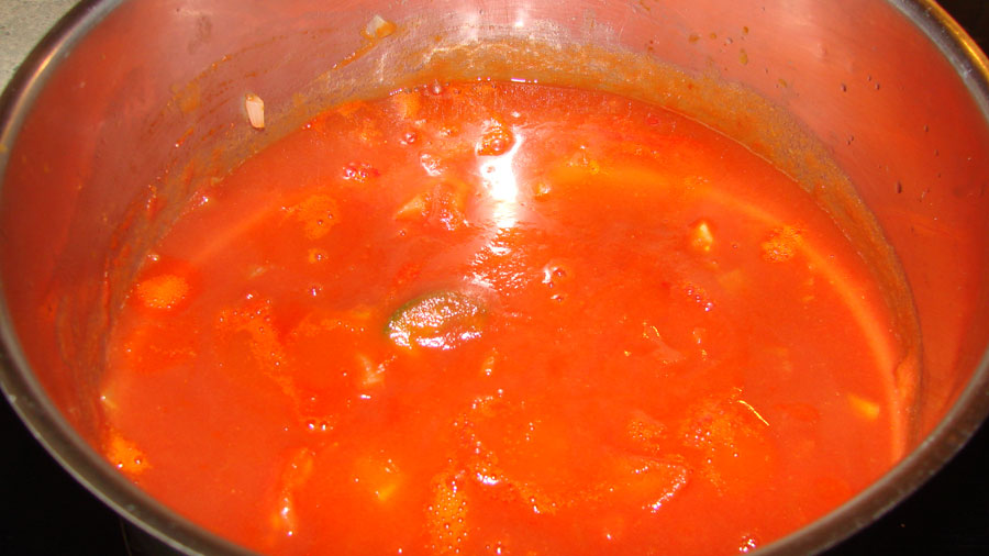 Die Zwiebeln darin glasig dünsten, den Zucker, das Tomatenmark und die Chilischote ebenfalls kurz mit anschwitzen.