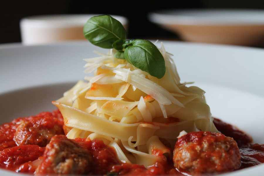 Die Fleischbällchen in die heiße Tomatensauce geben und mit Bandnudeln servieren.