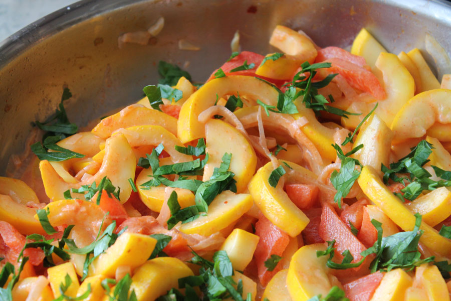Zum Schluss das Zucchini Gemüse mit ein paar Spritzern Zitronensaft abschmecken.