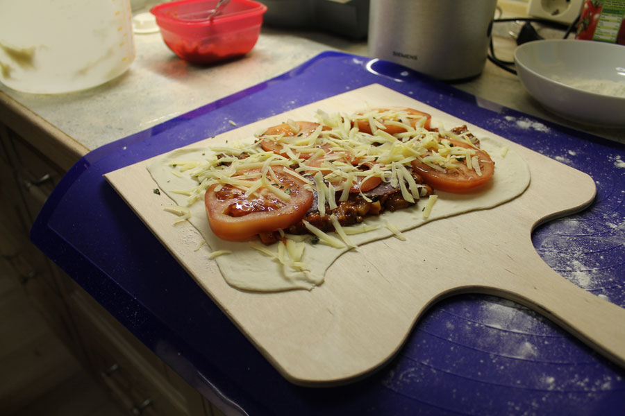 Die mitgelieferte Holzschaufel bemehlen und die ausgerollte Pizza darauf legen.