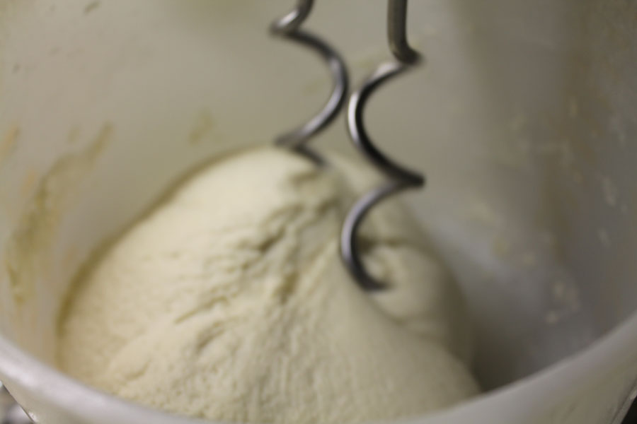 Mit den Knethaken eines Handrührgerätes von der Mitte aus einen Teil des Teiges verrühren.