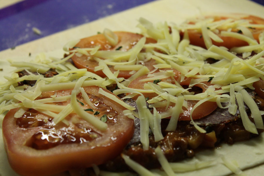 Mit dem Mozzarella belegen und ein wenig Bergkäse darüber streuen.