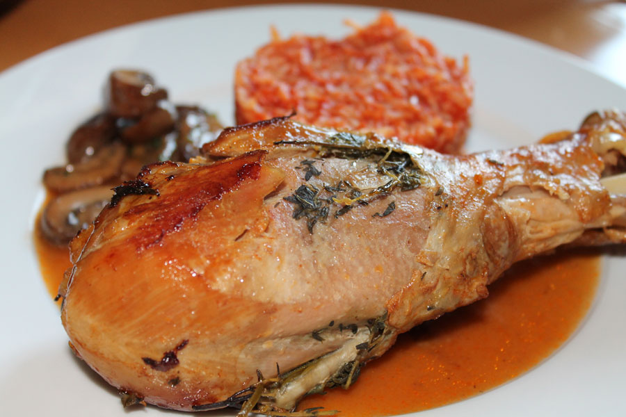 Tipp: Ich habe diese würzigen Putenkeulen mit Tomatenreis und Champignons serviert.