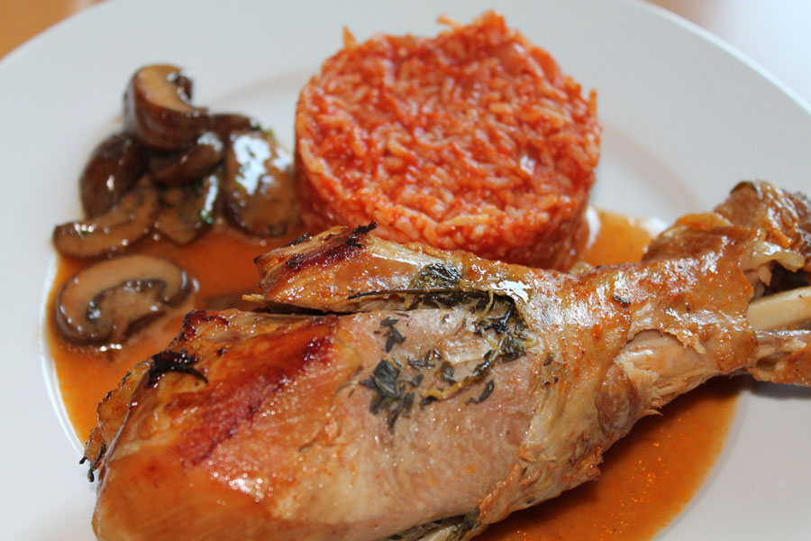 Ich habe diese würzigen Putenkeulen mit Tomatenreis und Champignons serviert.