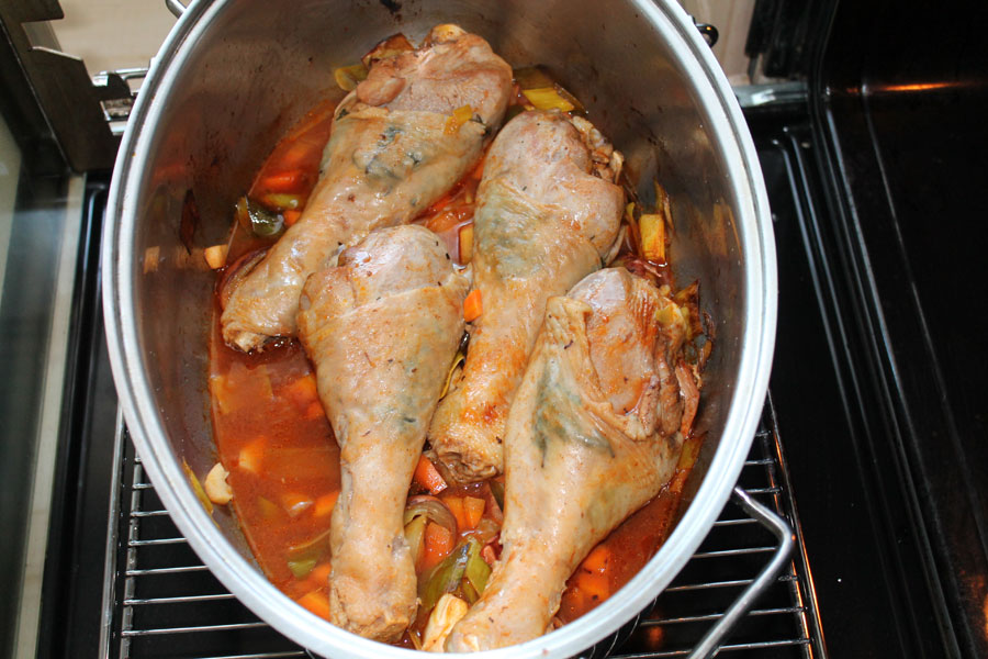 Alle 15 Minuten die Keulen mit dem Sud übergießen.