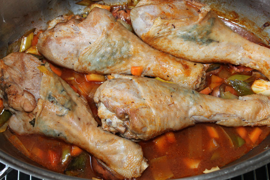 In einem Bräter Öl erhitzen und die Keulen von allen Seiten goldgelb anbraten.