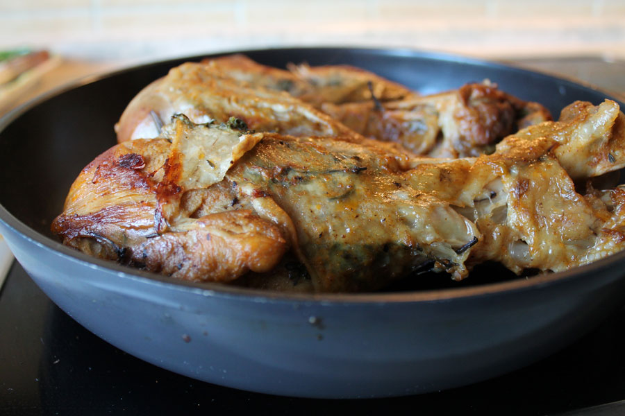 Wenn die Keulen gar sind, die Haut von allen Seiten noch unter dem Grill im Backofen bräunen.