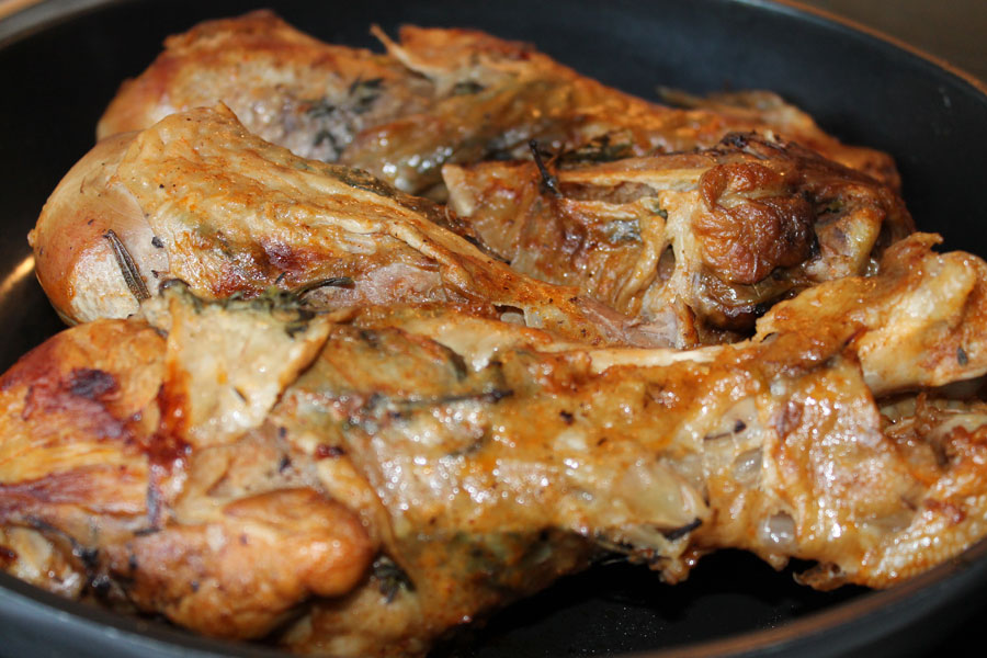Putenkeulen gelingen sehr gut im Backofen. Ich habe unter die Haut der Keulen sehr viele frische Kräuter geschoben. Damit bekommt das Fleisch ein sehr feines Aroma.
