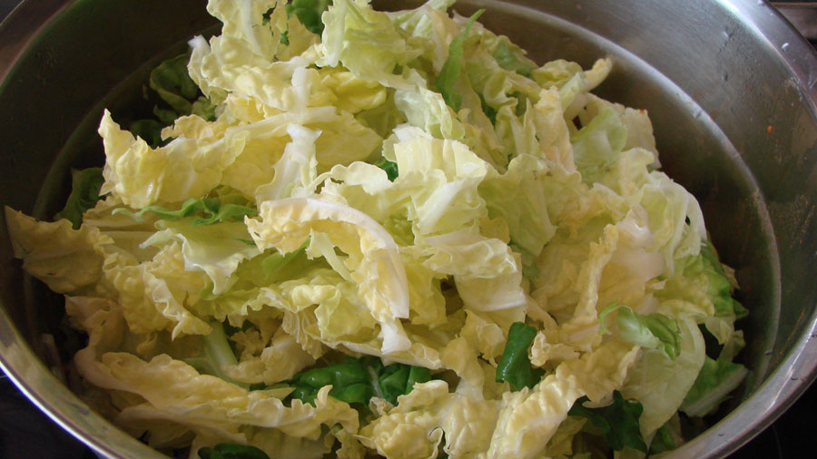 Alles ca. 5 Minuten köcheln lassen, die Wirsingkohlstreifen und das Salz dazugeben, gut umrühren und solange köcheln lassen bis der Wirsing gar ist aber noch Biss hat.