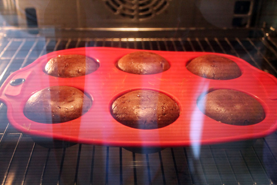 Den Teig gleichmäßig in die Muffinformen verteilen und im vorgeheizten Backofen auf der zweiten Schiene von unten bei 180 Grad Ober- und Unterhitze ca. 20-25 Minuten backen.
