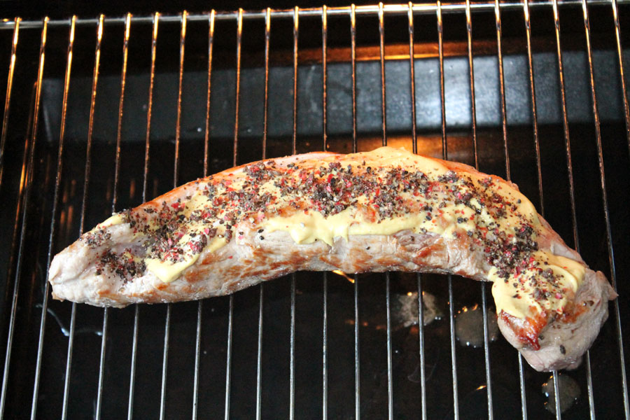 Das Filet aus der Pfanne nehmen, die Oberseite mit Senf bestreichen und den zerstoßenen Pfeffer darauf verteilen.