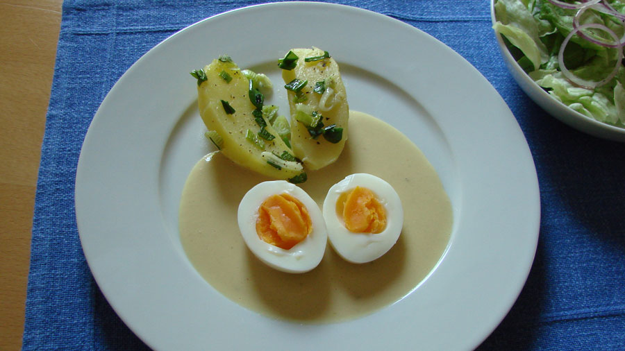 Senfeier mit Lauchzwiebeln Frühkartoffeln