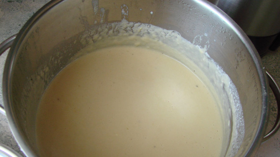 Milch dazugeben und alles gut umrühren und bei geringer Hitze einkochen lassen.