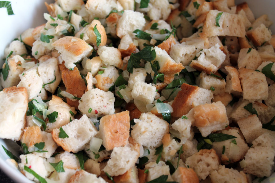 Die altbackenen Brötchen klein würfeln und in eine Schüssel geben.