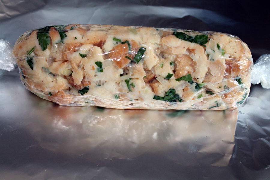 Nun mit der Frischhaltefolie die Masse gut verschließen und zu einem länglichen Bonbon drehen, so dass eine Rolle entsteht die dann in den Topf passt. Dann noch einmal in Alufolie fest verschließen, so dass kein Wasser an die Kloßmasse gelangen kann.