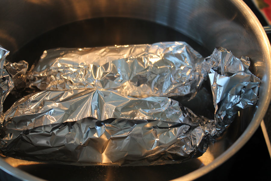 Die Folienpakete dann in siedendes Wasser geben und ca. 30 Minuten bei mittlerer Hitze garen.