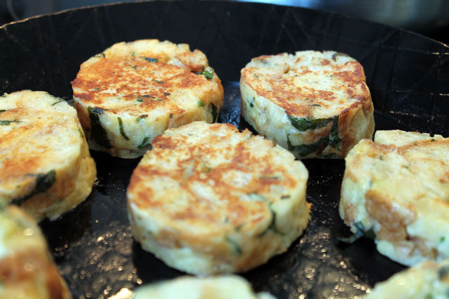 Dann aus der Folie nehmen und in Scheiben geschnitten sofort servieren. Ich habe meine Kloßscheiben noch in heißem Butterschmalz von beiden Seiten goldbraun gebraten, da sie uns mit dieser leichten Kruste besser schmecken.