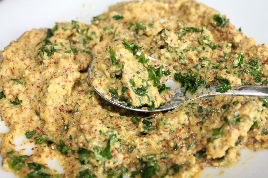 Ich habe zu meinem Risotto ein mit Senf überbackenes Steak serviert.