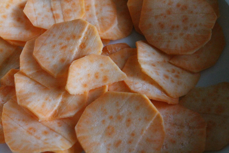 Ich habe aus Süßkartoffeln Chips zubereitet.