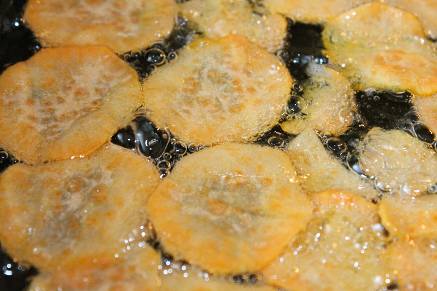 Die Süßkartoffelscheiben goldgelb frittieren.