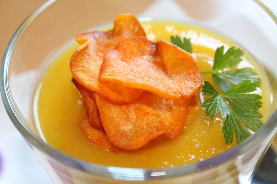 Diese Süßkartoffel Chips sind nicht nur lecker als Knabberei, sondern sie machen aus einer einfachen Suppe einen richtigen Hingucker.