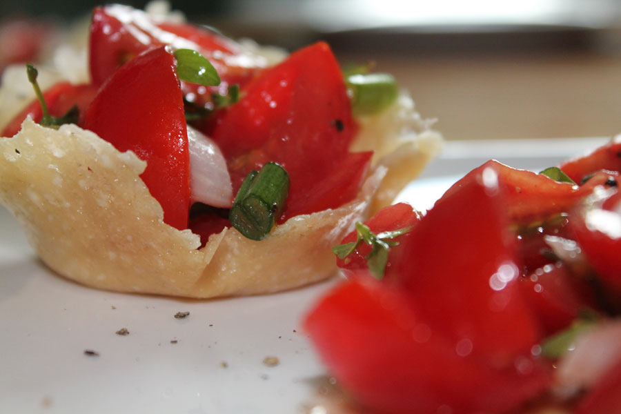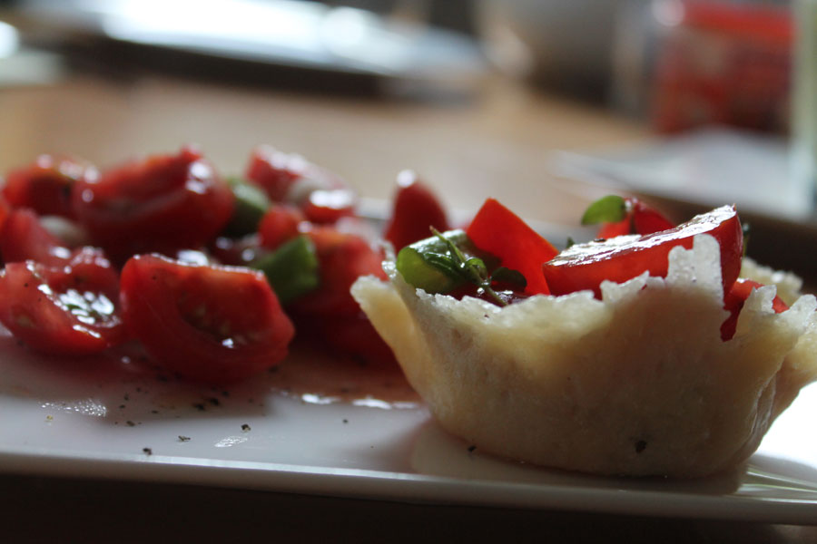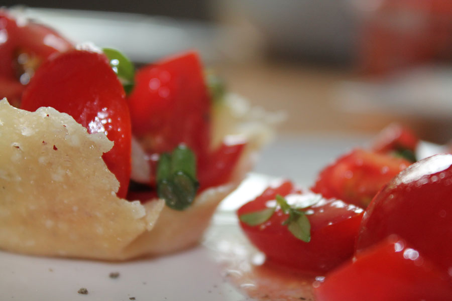 Dieser Tomatensalat in einem Parmesanschüsselchen ist ein absoluter Hingucker auf jeden Tisch. Außerdem schmeckt er auch noch himmlisch.