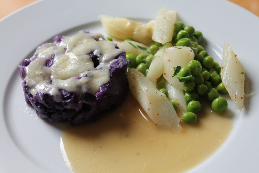 Die Trüffelkartoffeln passen hervorragend zu Erbsen Spargelgemüse und Weißweinsauce.