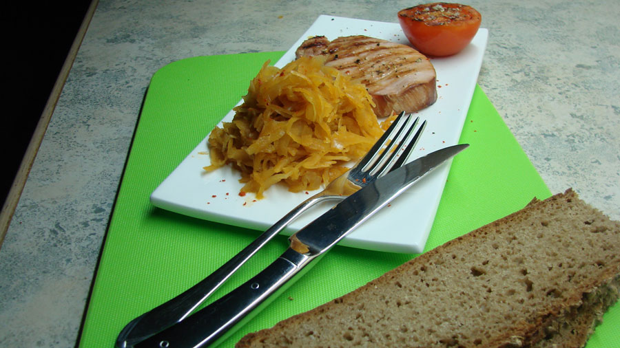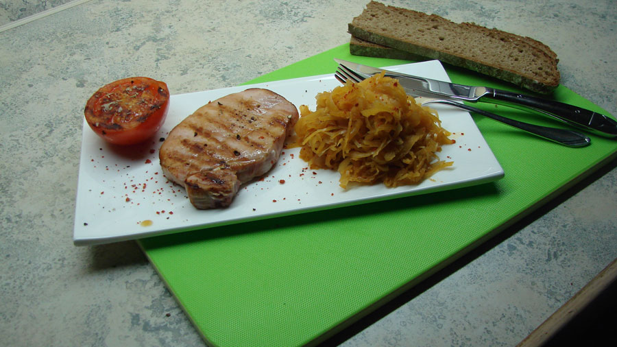 Dieses ungarische Sauerkraut passt sehr gut zu einem Kasslersteak, das in einer Grillpfanne mit nicht zu starker Hitze von jeder Seite 3 Minuten gegrillt wird.