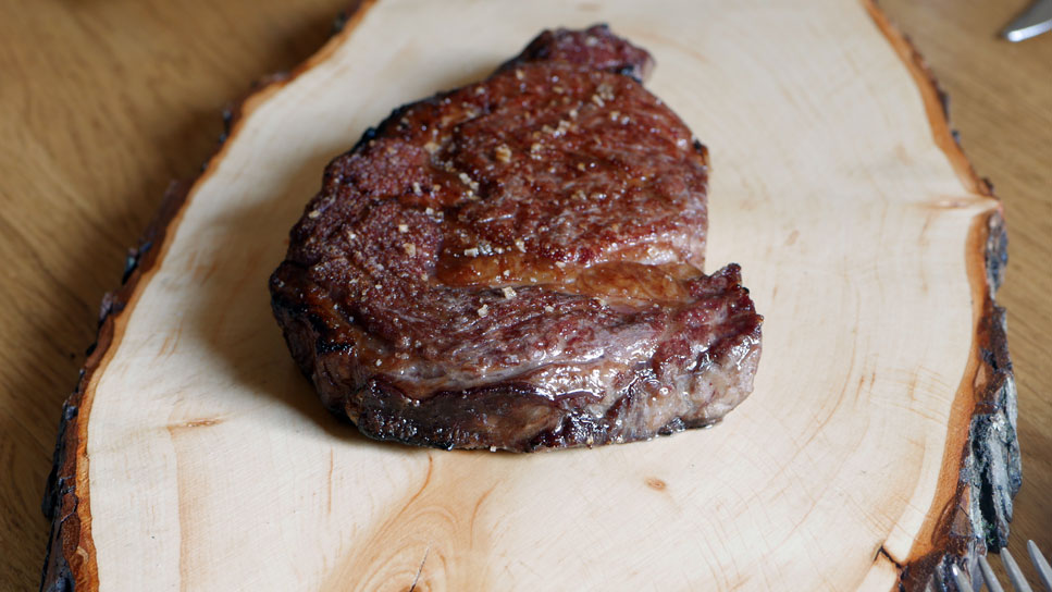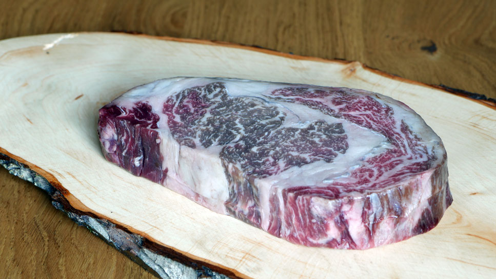 Das Wagyu Entrecôte sollte Zimmertemperatur ca. 21 °C haben, das heißt ca. 1-1,5 Stunden vor der Zubereitung aus dem Kühlschrank nehmen.