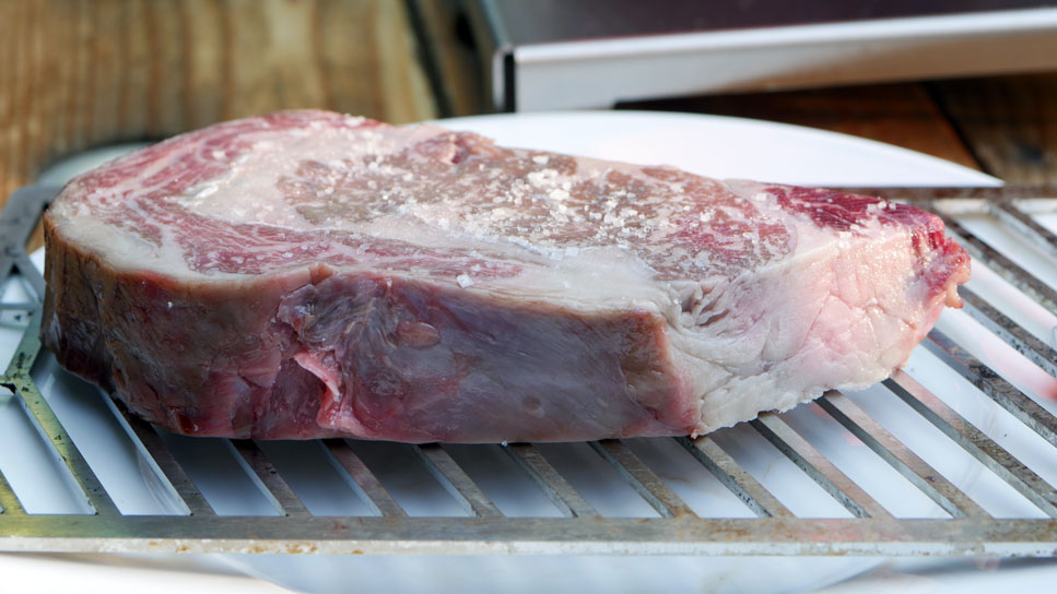 Das Entrecôte vor dem Beefen mit ganz grobem Meersalz würzen und leicht in das Fleisch eindrücken. Das grobe Meersalz karamellisiert unter dem Beefer und sorgt für eine einzigartige Kruste.