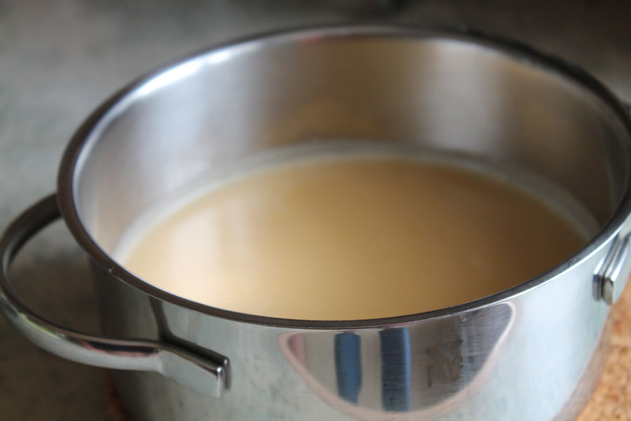 Mit einem Fond (z.B. Spargelfond) und der Sahne auffüllen und unter Rühren aufkochen lassen.