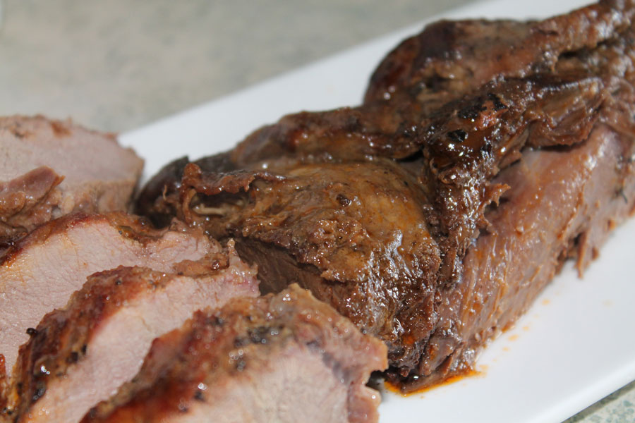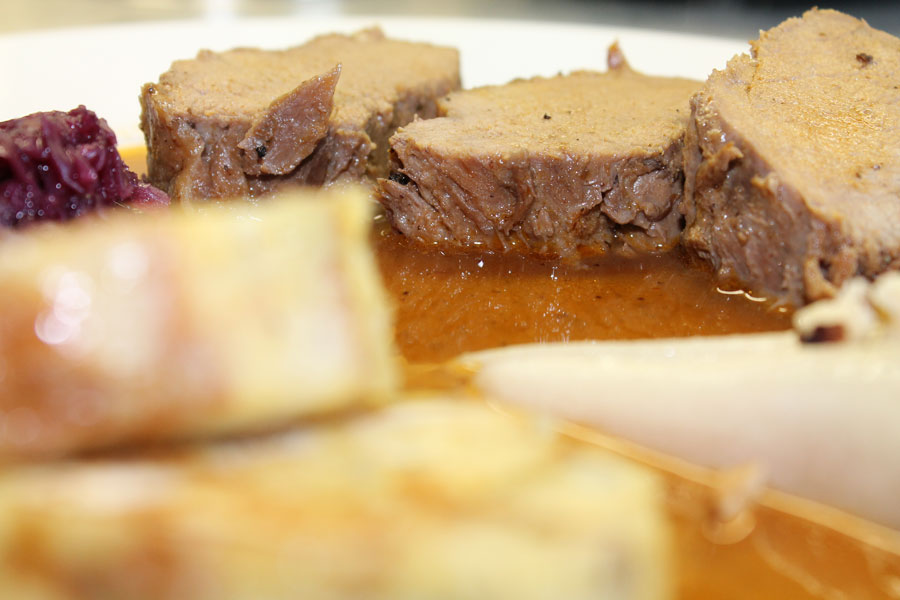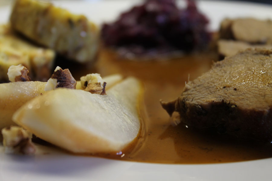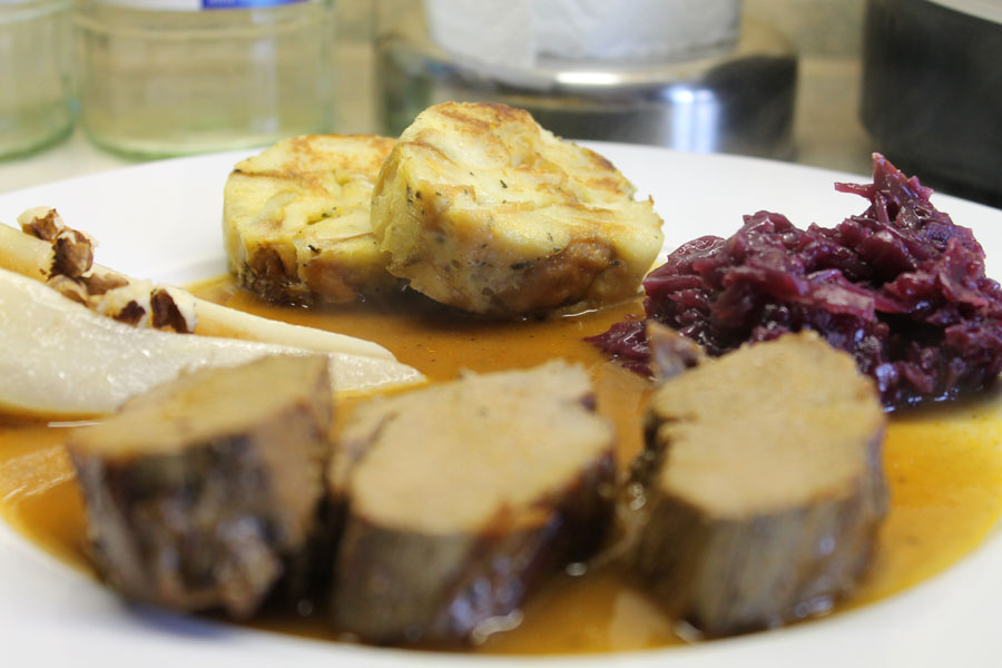 Zu diesem Wildschweinbraten passen sehr gut Rotkohl und Laugenbrezelknödel.