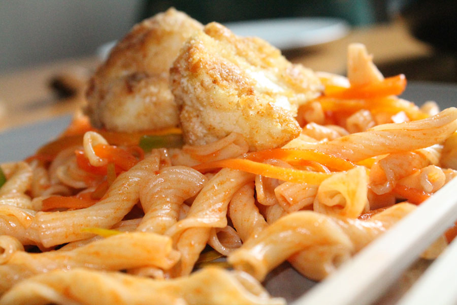 Zuerst für die Wok Nudeln die Mohrrübe schälen, den Porree putzen und beides in dünne Streifen schneiden. Die Paprikaschote entkernen, schälen und ebenfalls in Streifen schneiden. Die Pasta nach Packungsbeilage al dente“ kochen. In einem Wok ein wenig Sesamöl nicht zu stark erhitzen. Das Gemüse kurz anschwitzen, das Tomatenmark und den Chili dazugeben und mit etwas heißem Pasta Wasser oder Gemüsebrühe auffüllen. Den Ingwer schälen, reiben, in den Wok (Link zu Amazon) geben und alles einmal aufkochen lassen. Dann die Pasta unterheben und mit Salz abschmecken. Die Wok Nudeln mit dem gebackenen Blumenkohl servieren.