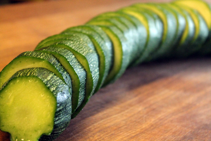 Die Zucchini waschen, die Enden abschneiden und in nicht zu dicke Scheiben schneiden.