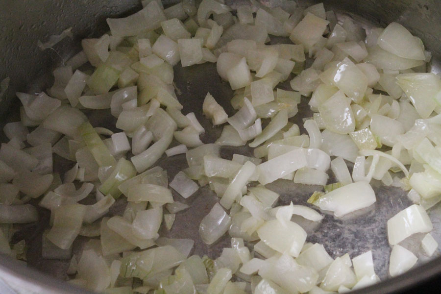 Olivenöl in einem Topf erwärmen und die Zwiebeln darin glasig dünsten.