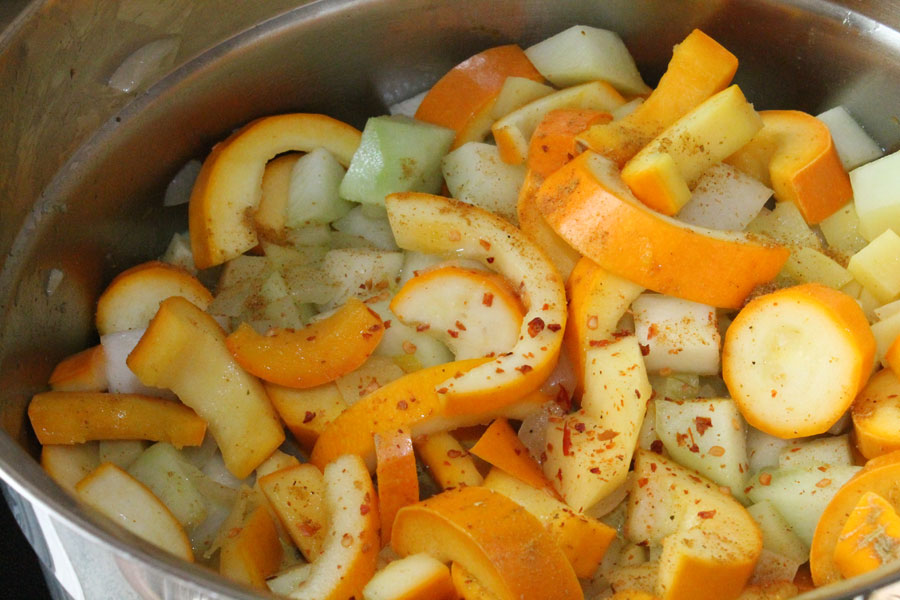 Das Currypulver, die Prise Zucker, den Chili, das Gemüse und die Kartoffeln dazugeben und kurz anschwitzen.