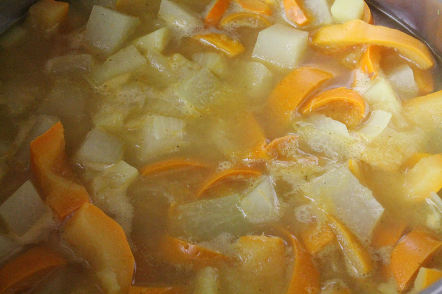 Mit Salz würzen, das Wasser dazugeben und alles bei geringer Hitze weich kochen.