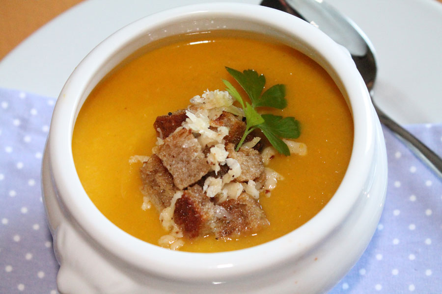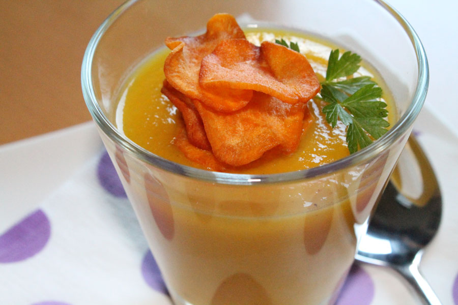 Ich habe diese scharfe Gemüsesuppe als 1. Variante mit Süßkartoffelchips und als 2. Variante mit Parmesan Croutons serviert. Beide Varianten waren sehr lecker!