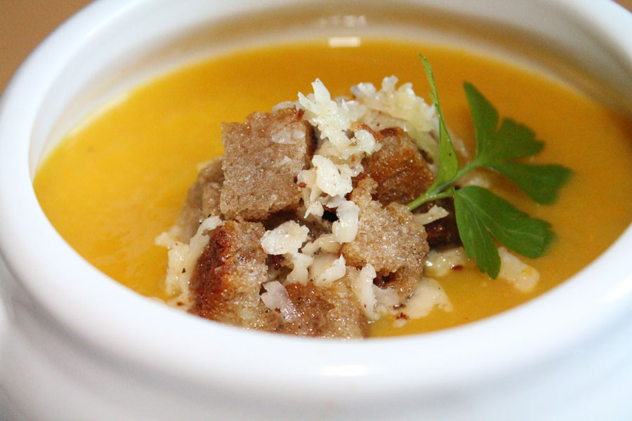 Die scharfe Gemüsesuppe mit Süßkartoffelchips oder Parmesan Croutons servieren.